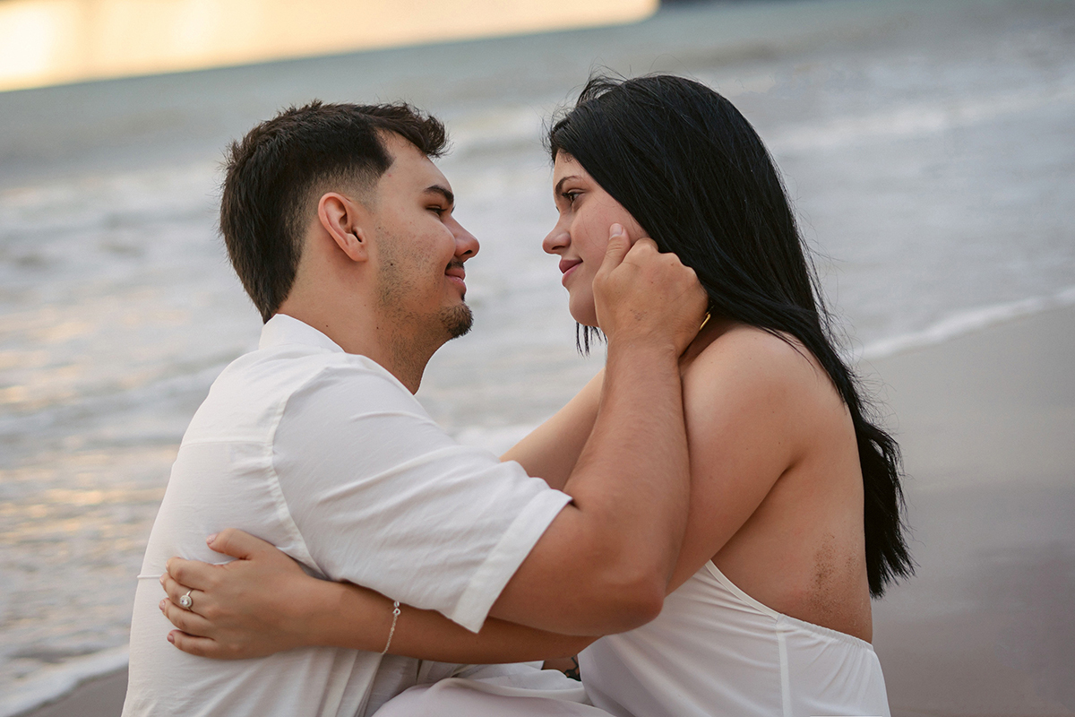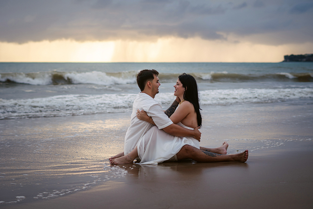 Entre a brisa suave, o som das ondas e a luz dourada que só o amanhecer oferece, cada clique contou parte dessa história. O resultado? Um ensaio leve, romântico e cheio de verdade, celebrando não apenas o compromisso, mas a sintonia que os une.